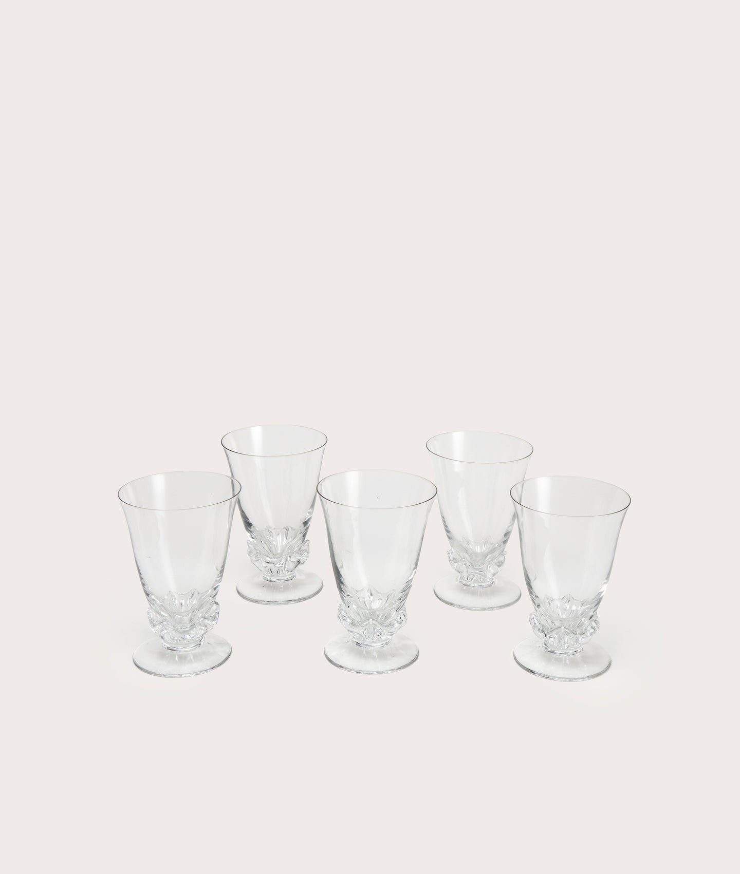 Tall glasses with ornate detailing at the footed base, perfect for water or a spritz. Sourced in Paris. Set of 5.