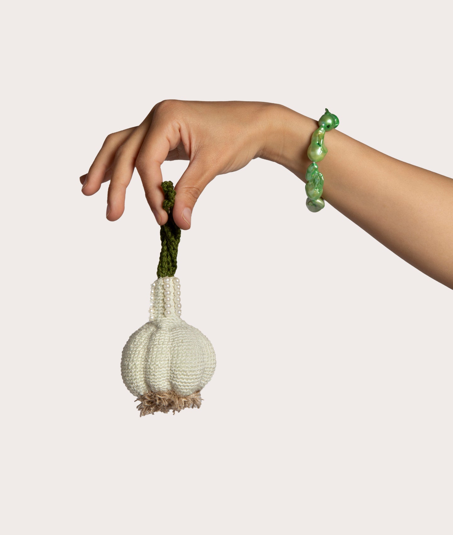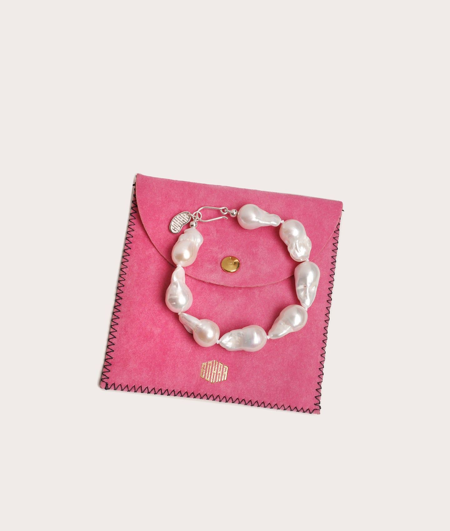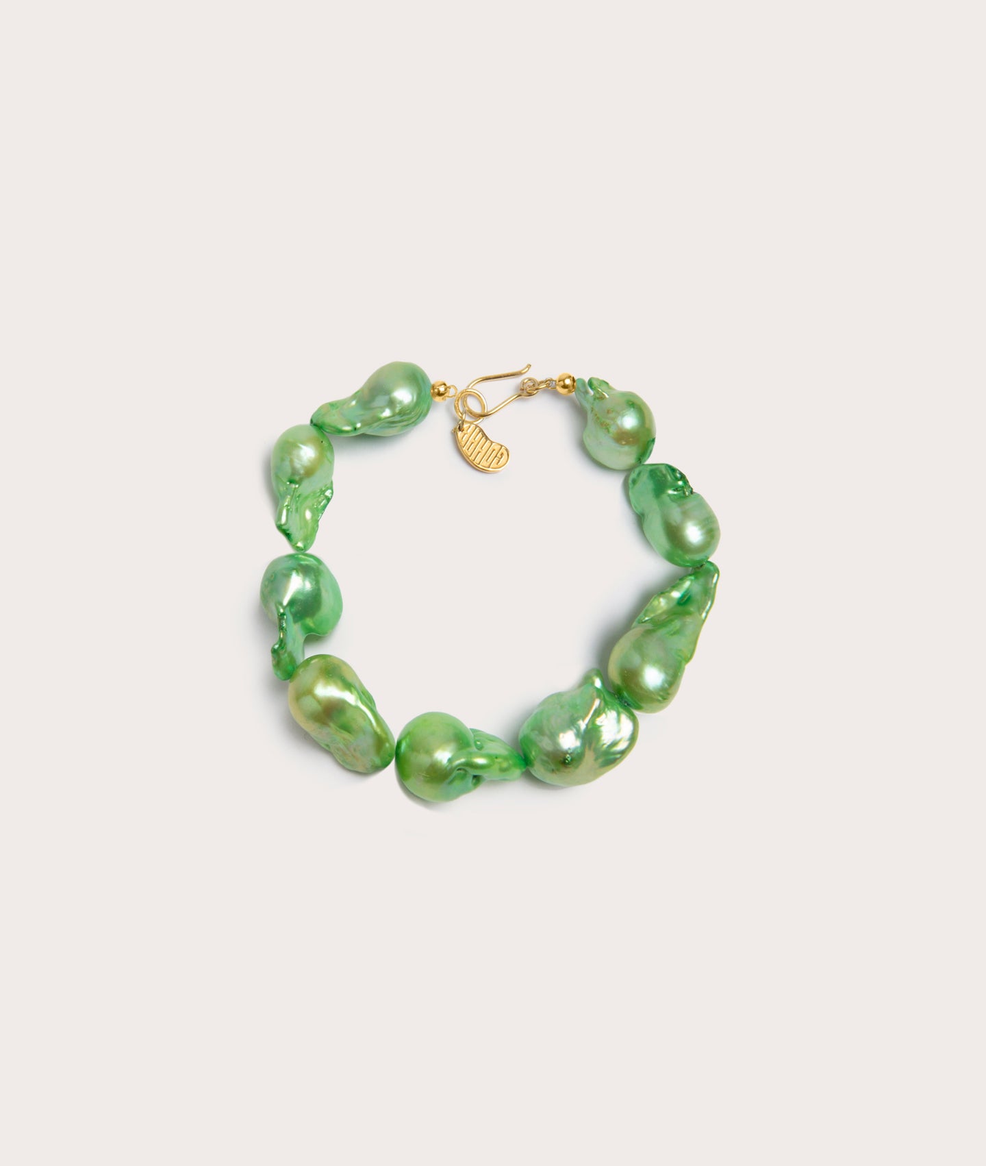 Unique, irregular green baroque pearls are fastened with a gold-plated hook to form our first Gohar bracelet. Reminiscent of fava beans strung together on a silk cord.