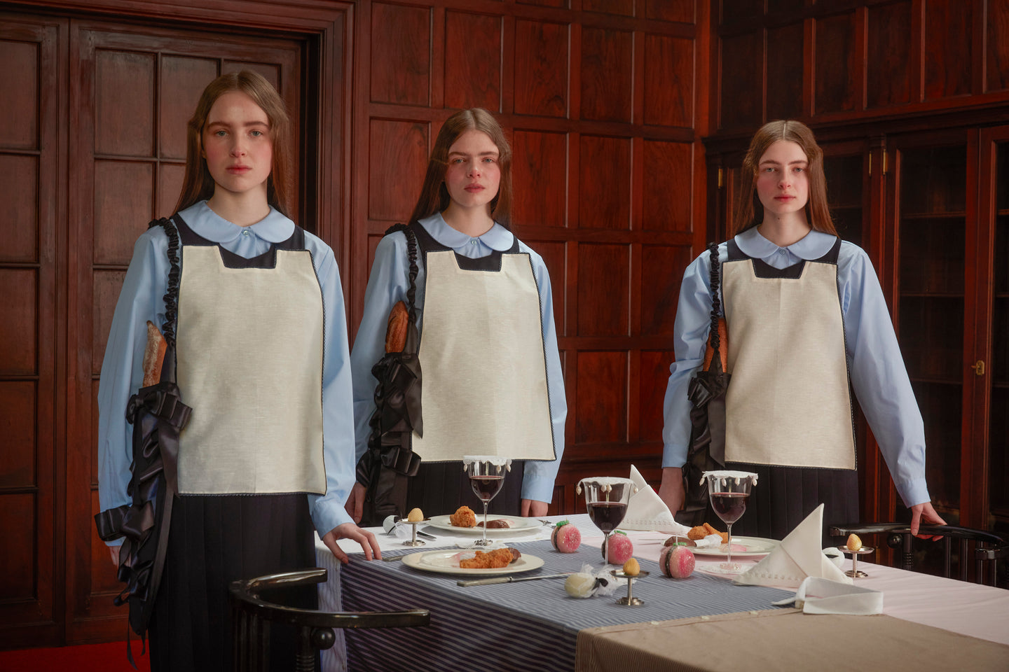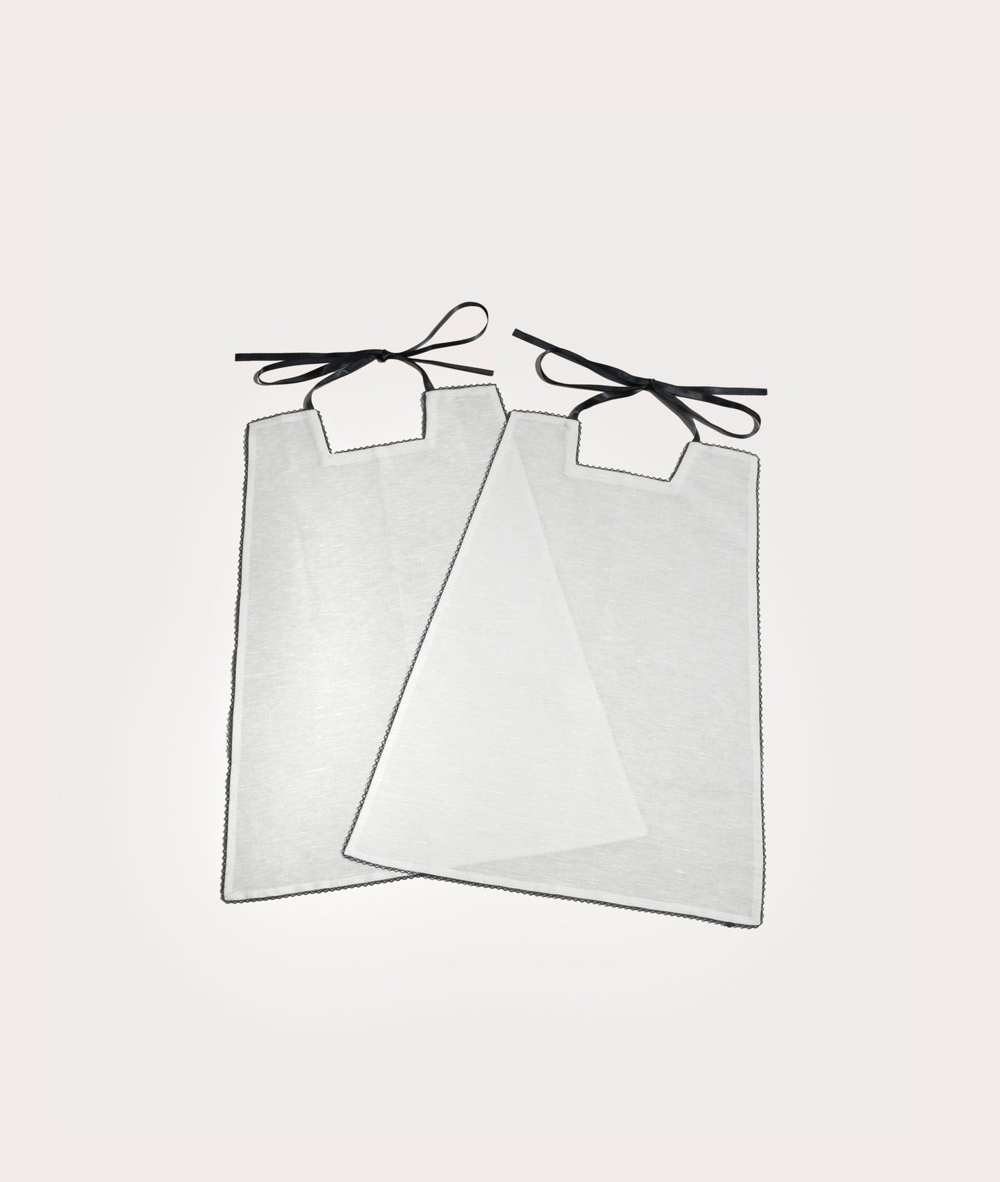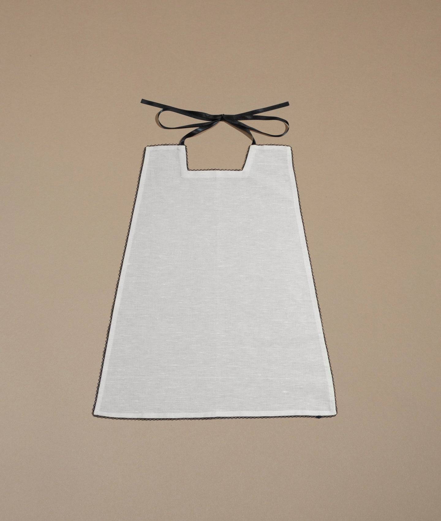 Sewn by hand in Cairo, these ivory bibs are finished with a black trim and satin ribbon.