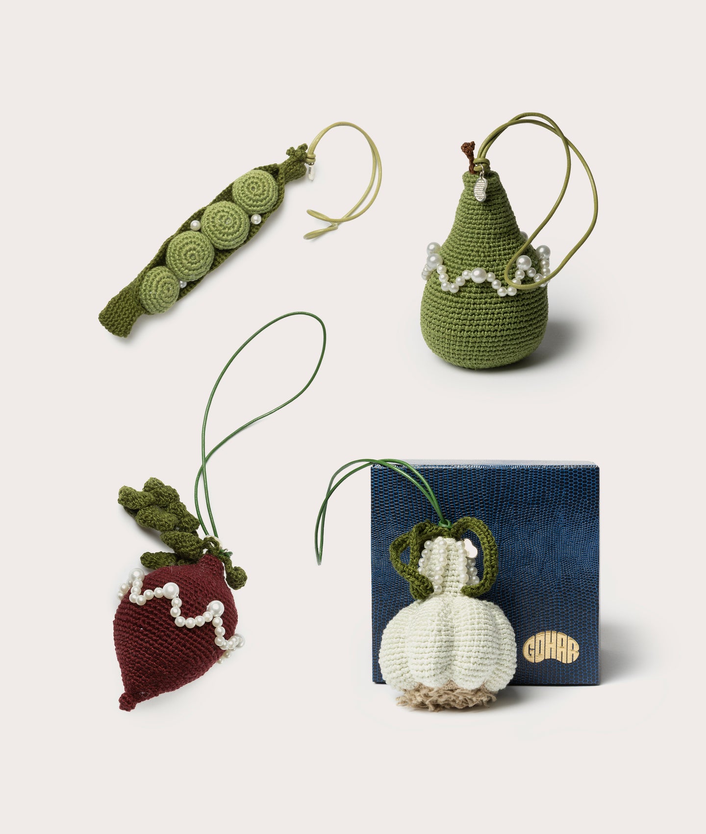 Handmade in Egypt from cotton with leather straps, each crocheted charm dangles like a soft relic of the harvest. Choose from Beet, Bean, Garlic, or Pear — a distinctive gift to collect and treasure.