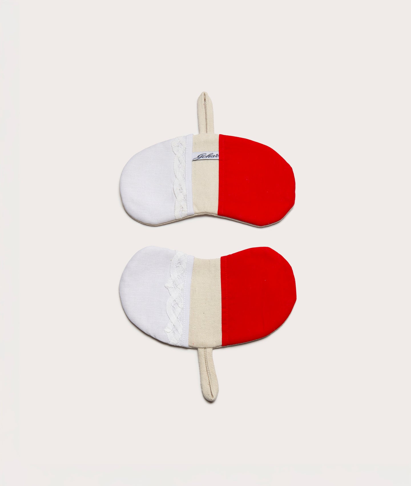 Protect your hands with this pair of padded bean-shaped pot mitts; a classic symbol of the house.
