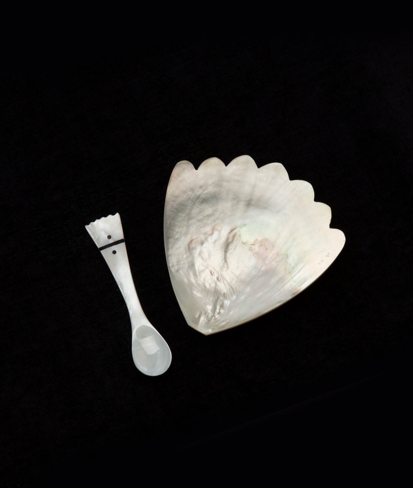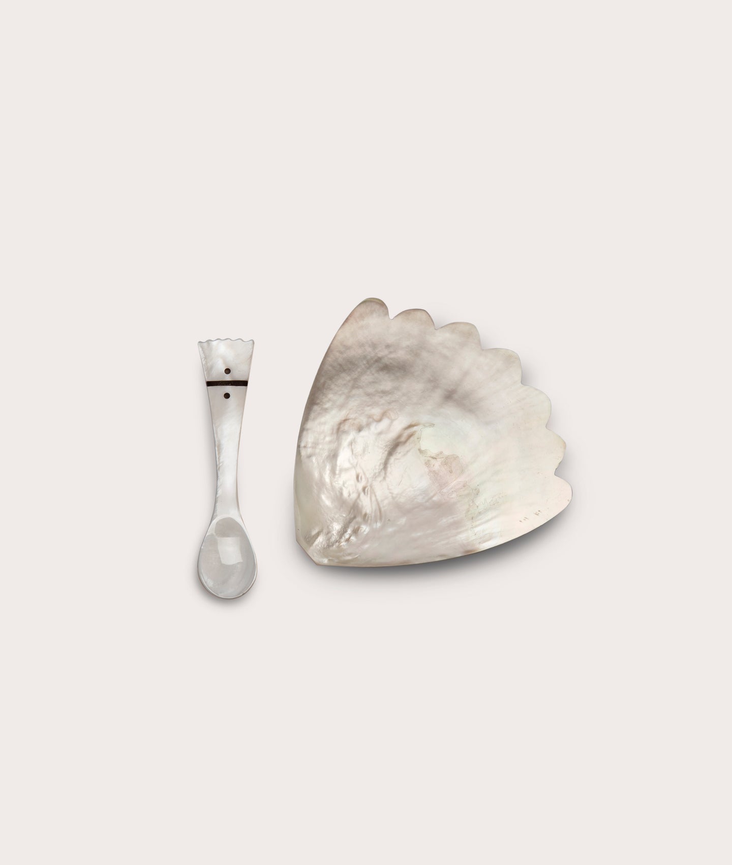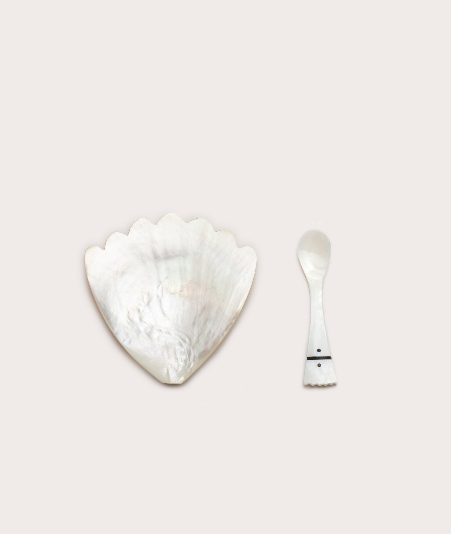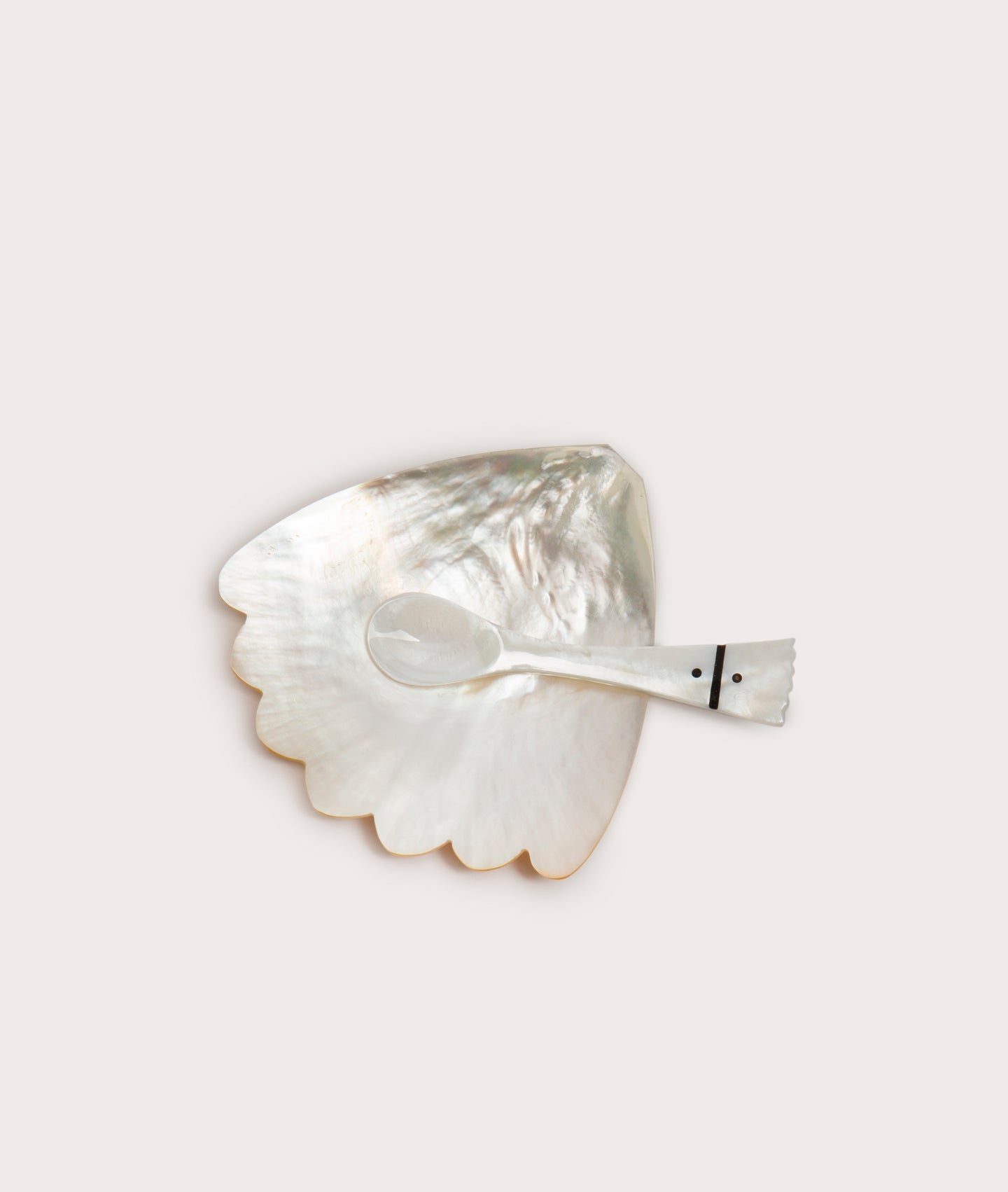 Set of two: our mother of pearl Coquille dish and a matching spoon.