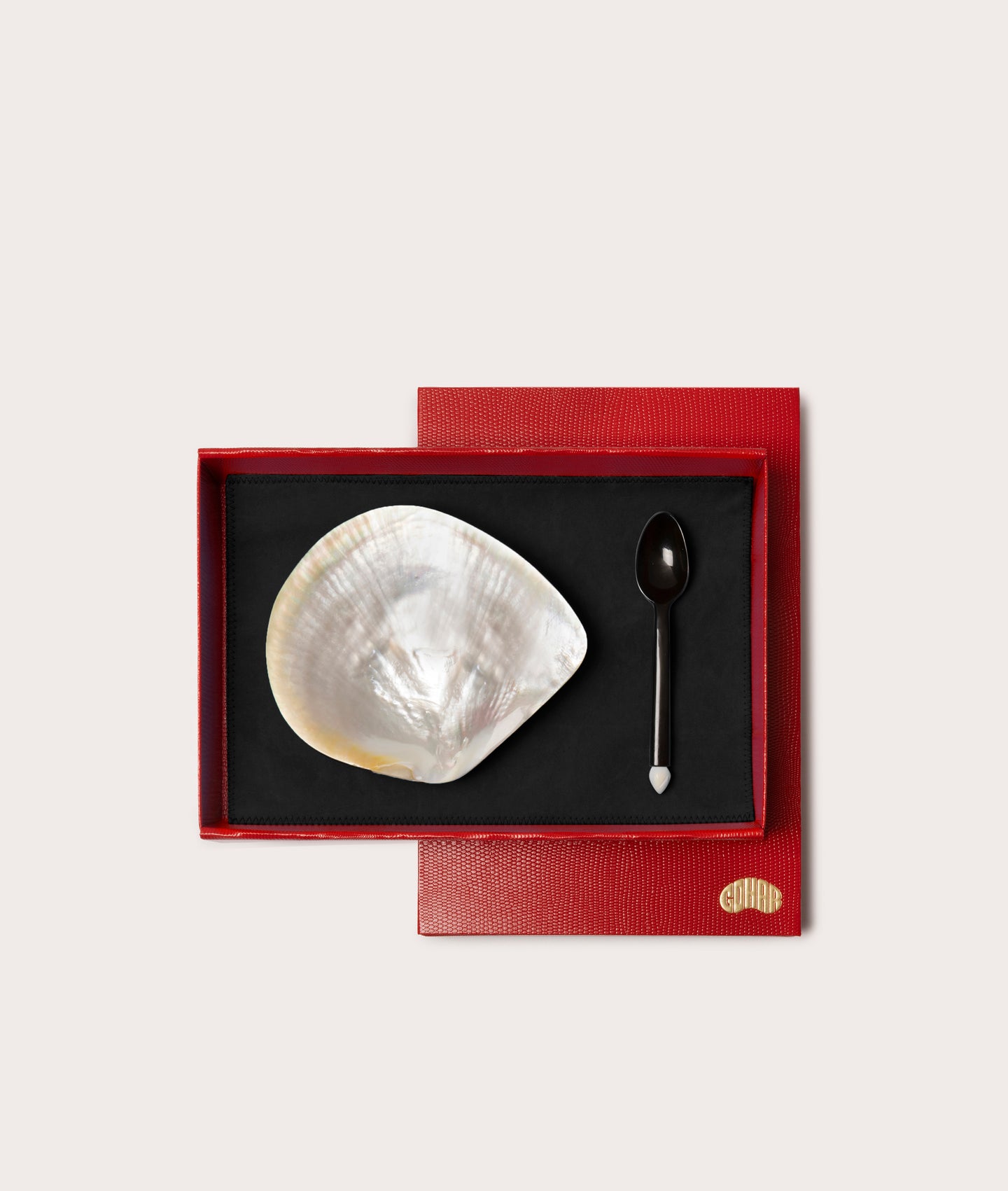 Hand-carved in Vietnam from farmed horn and cultivated mother of pearl, it marries two noble materials in gleaming contrast, perfect for caviar service. Designed for gatherings, it brings a special touch to the table.