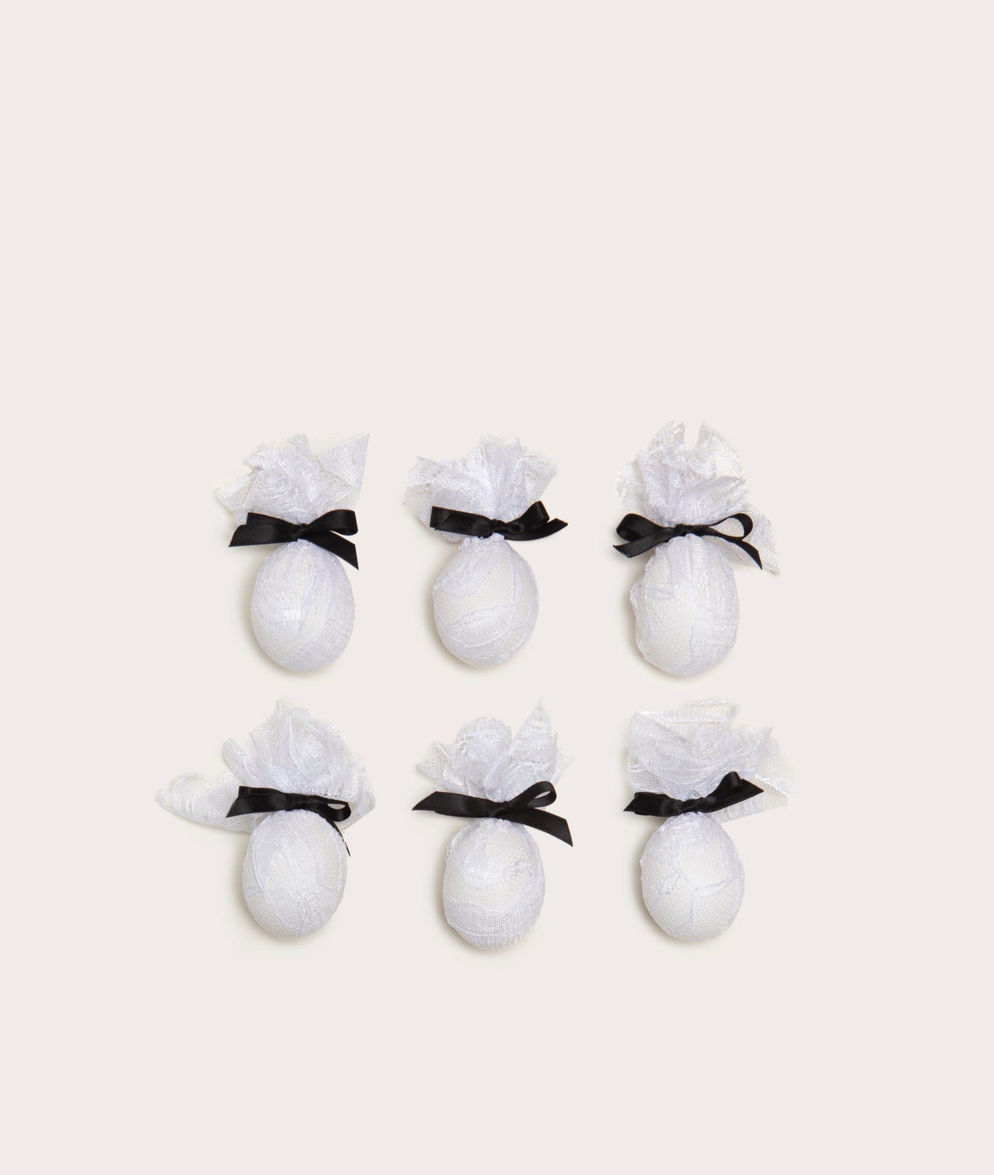 A set of scallop-edged lace rounds, that cinch at the top with a satin ribbon, and work perfectly as an egg dress. Why just eat your eggs when you can dress them up, too?