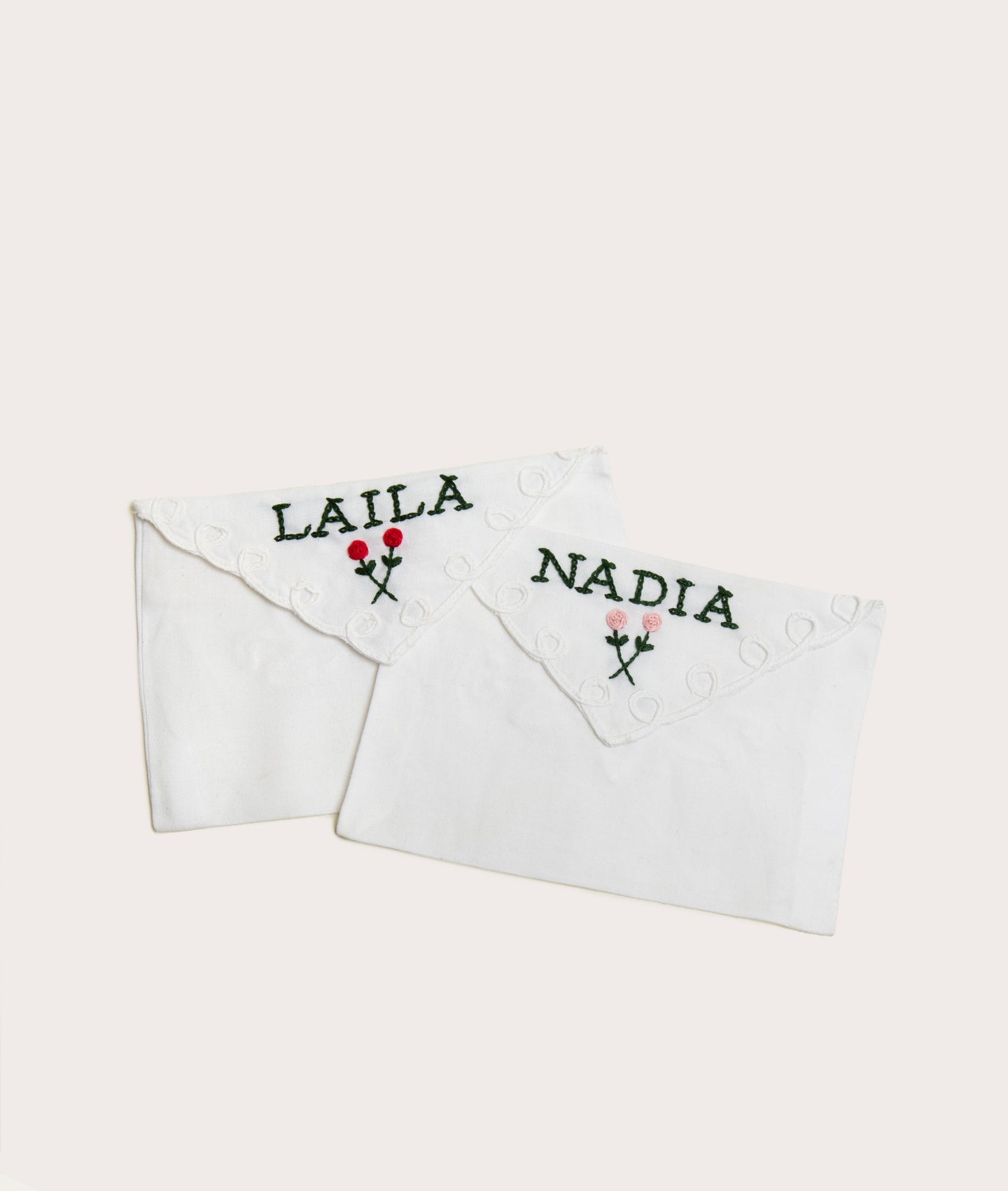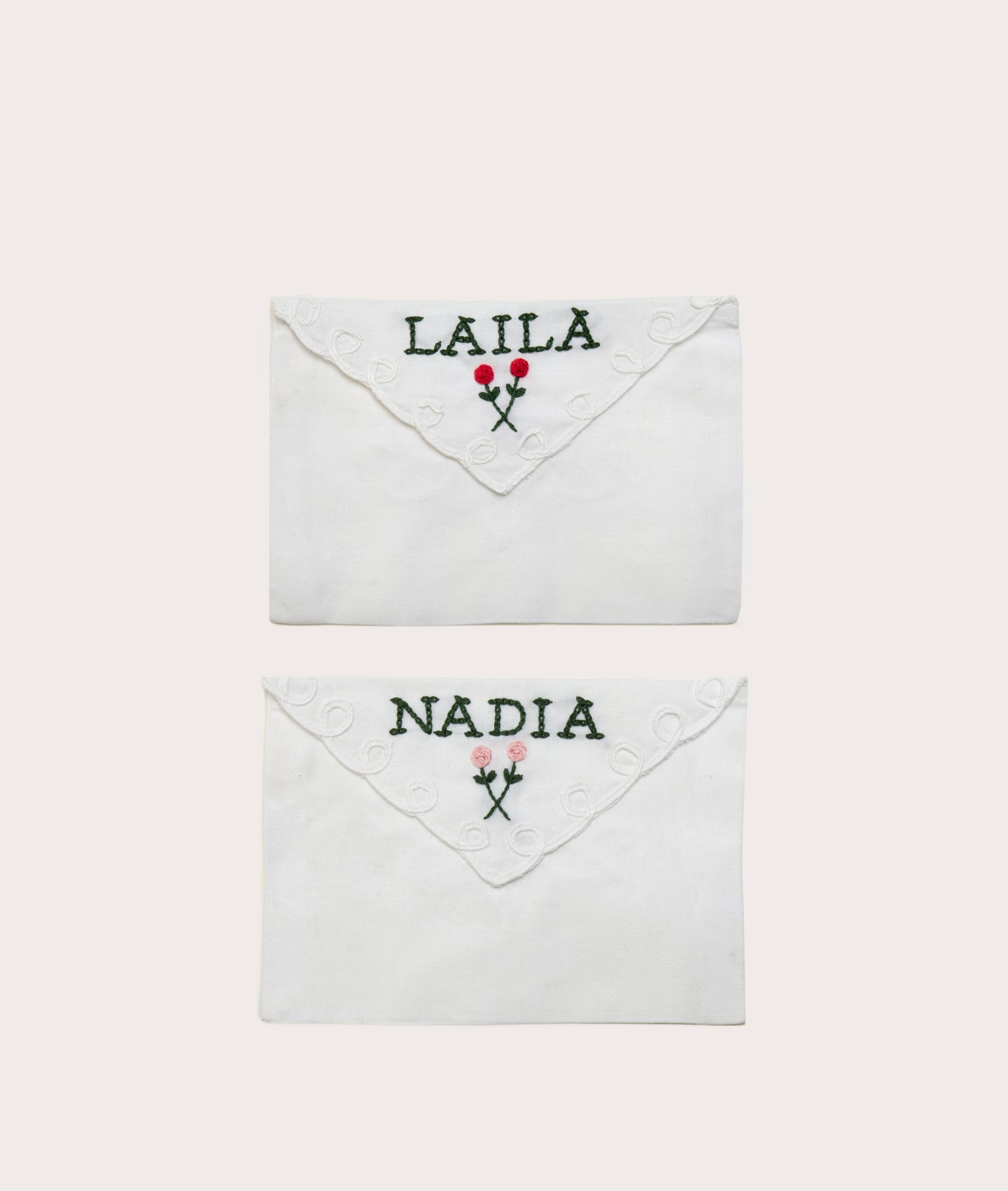 A pair of white embroidered lace envelopes, personalized with your initials or those of your beloved. This makes a beautiful wrapper for thank you notes and invites.