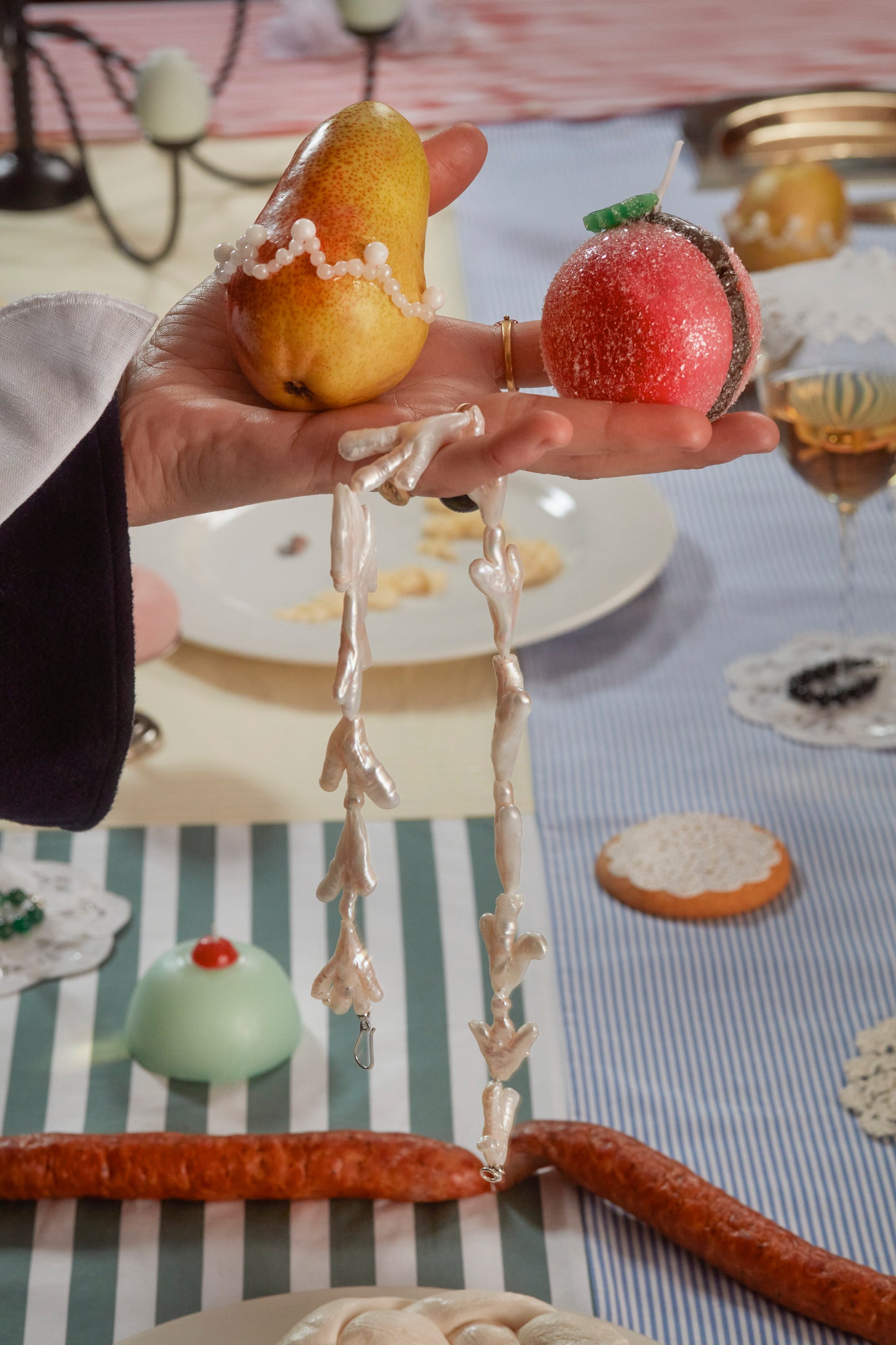 Strung on silk cord with freshwater pearls in the shape of a chicken's foot, this necklace makes the perfect host gift, be you the guest - or the host.