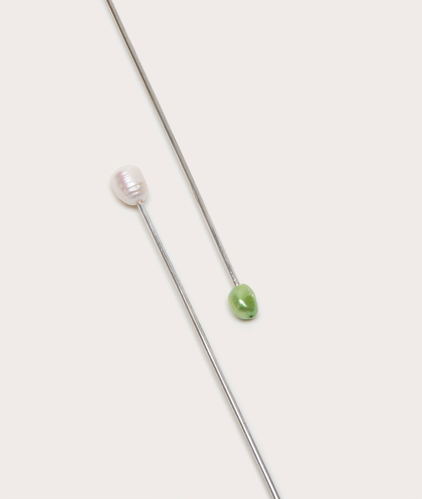 Made in a Cairo atelier, this pair of long spoons is copper based and silver-plated and features a delicate hammering on the spoon's head and a small pearl on the end.