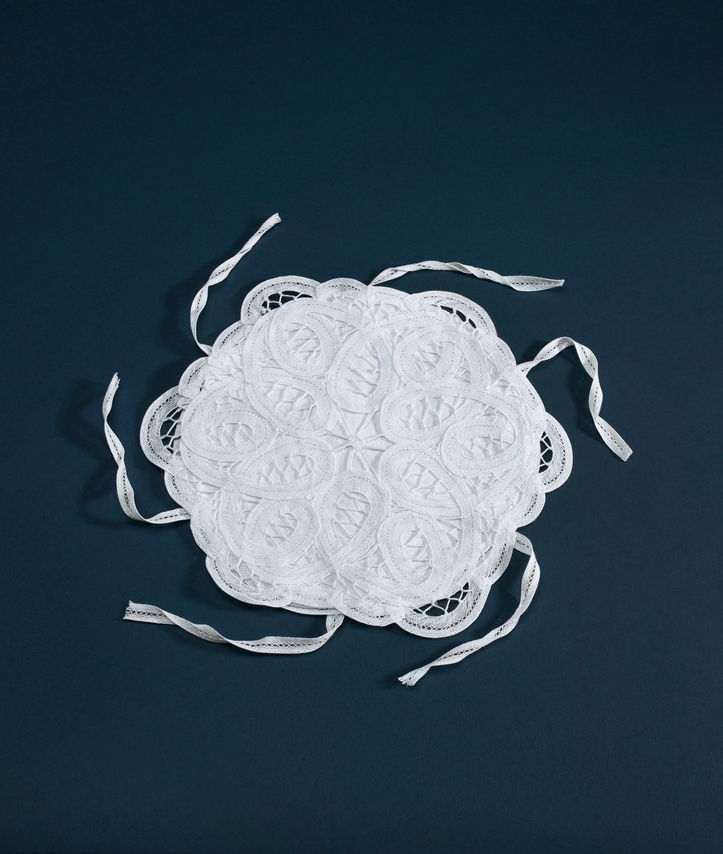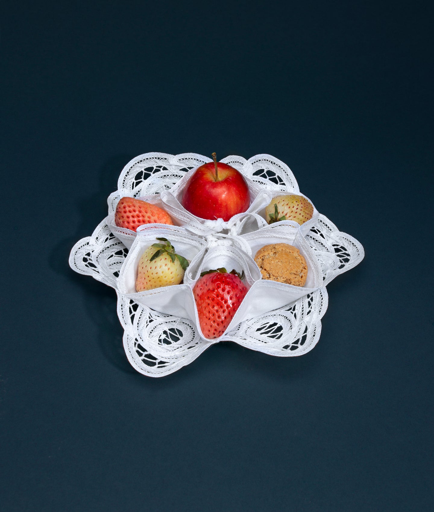 A white lace doily basket with pockets. Handmade in Italy, this is the ideal way to present delicacies, from fresh fruit to amuse bouche. Comes with six small compartments.