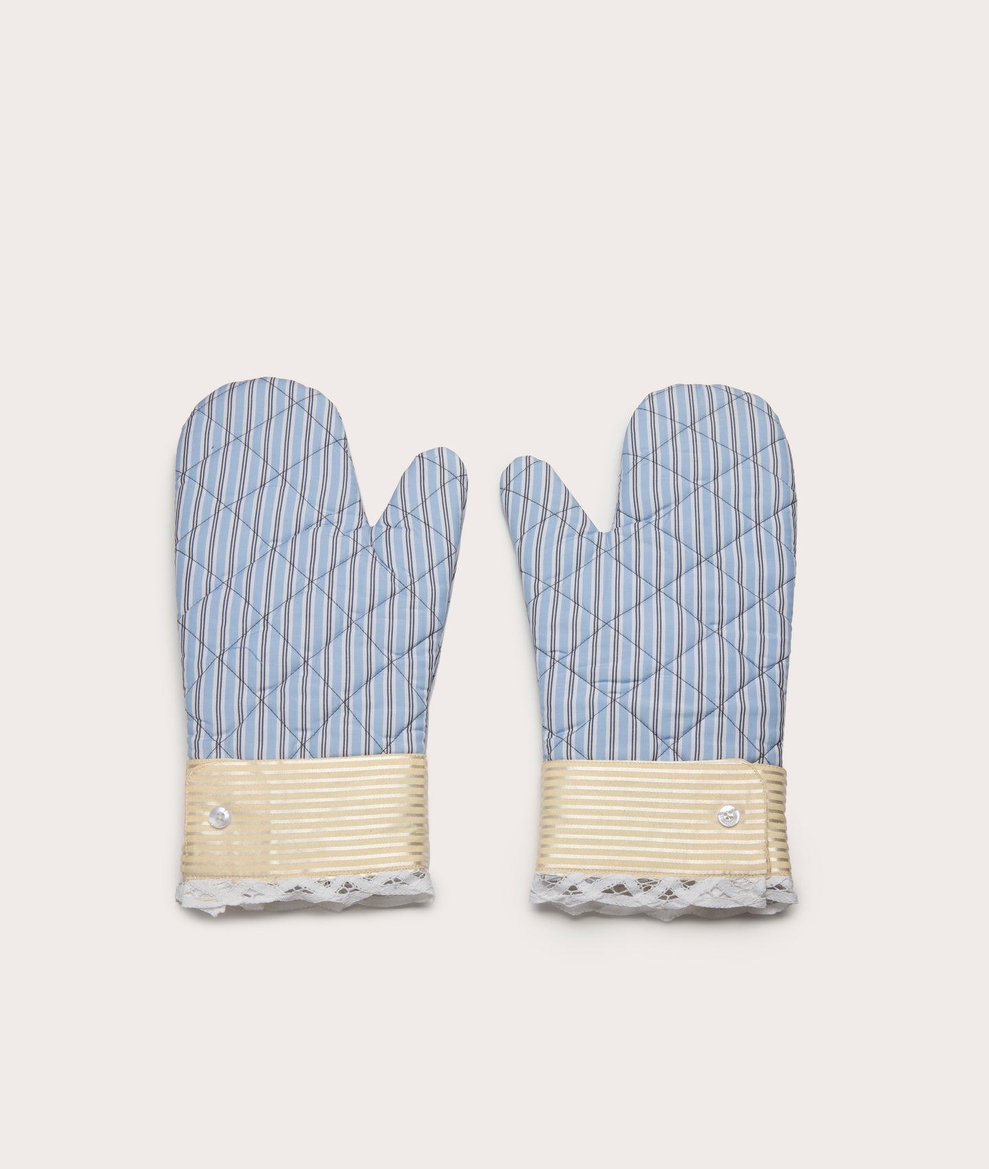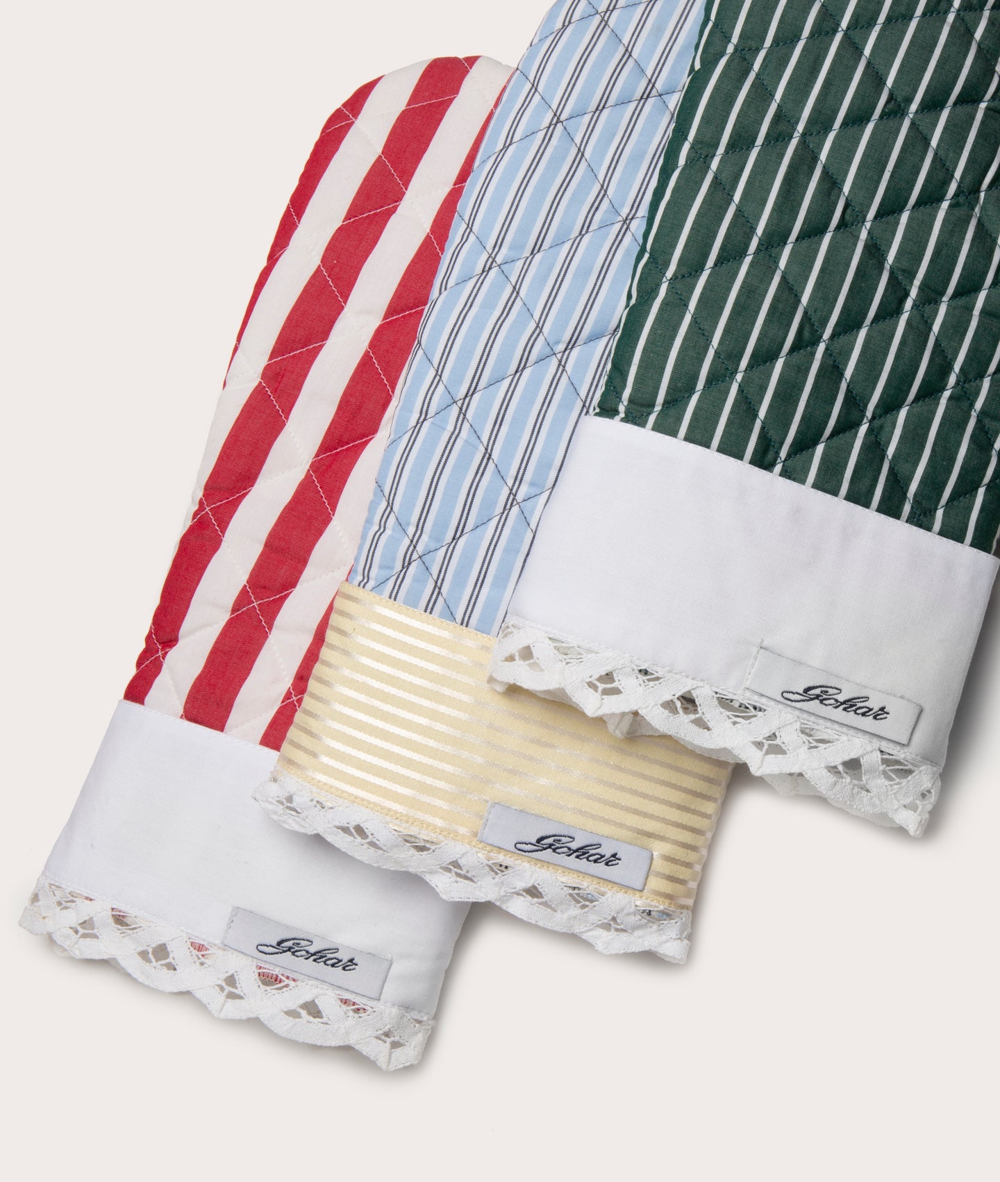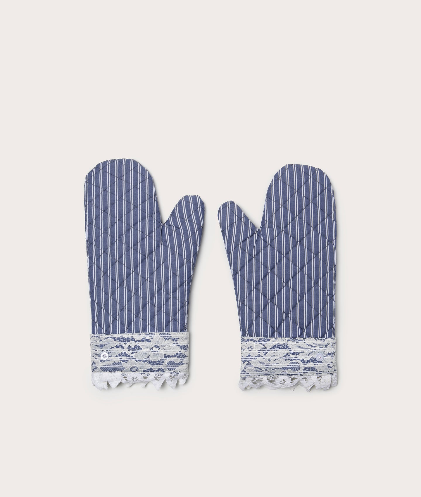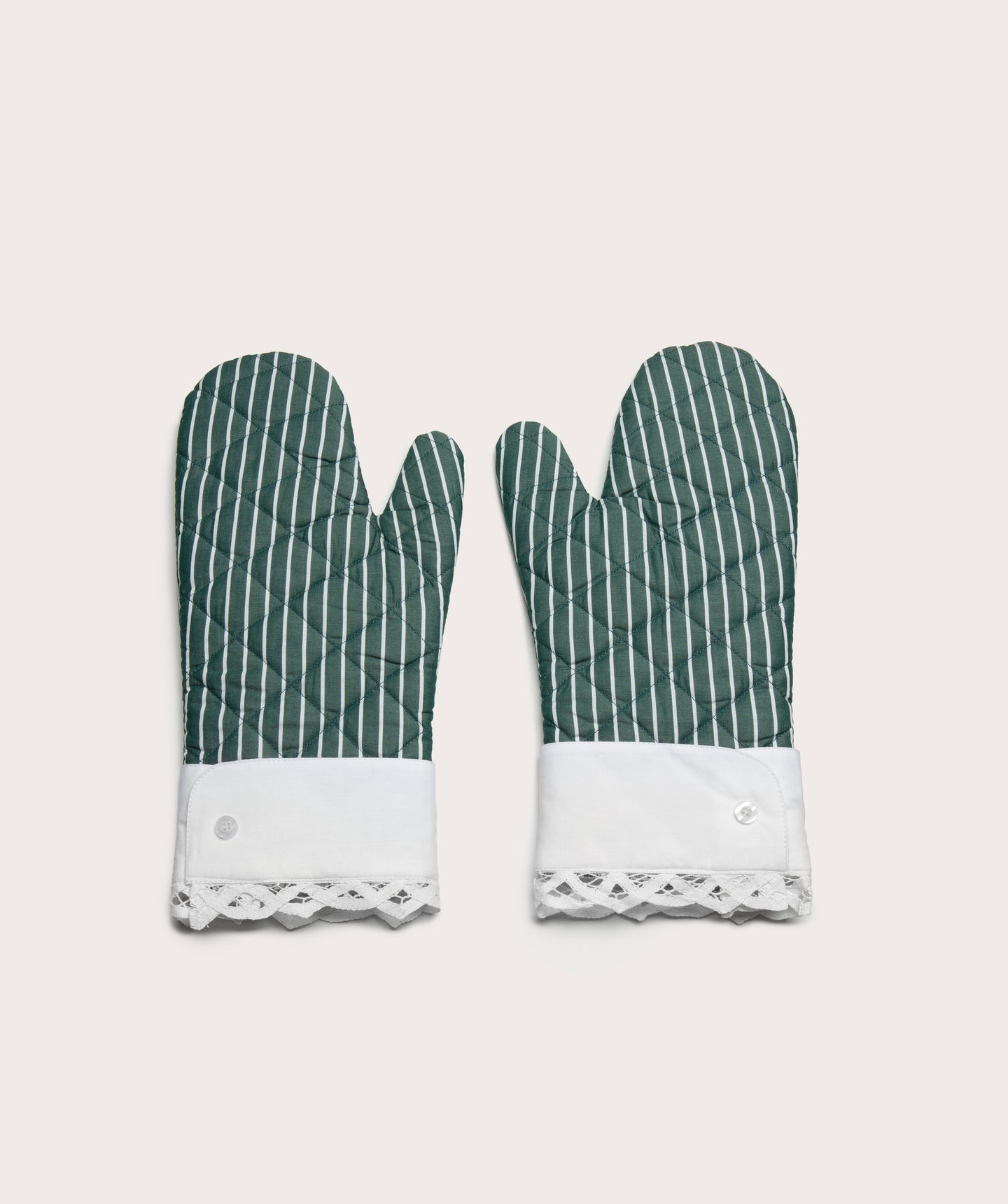 A pair of padded, cotton oven mitts with a white Battenburg lace trim. What we wear when cooking in company.