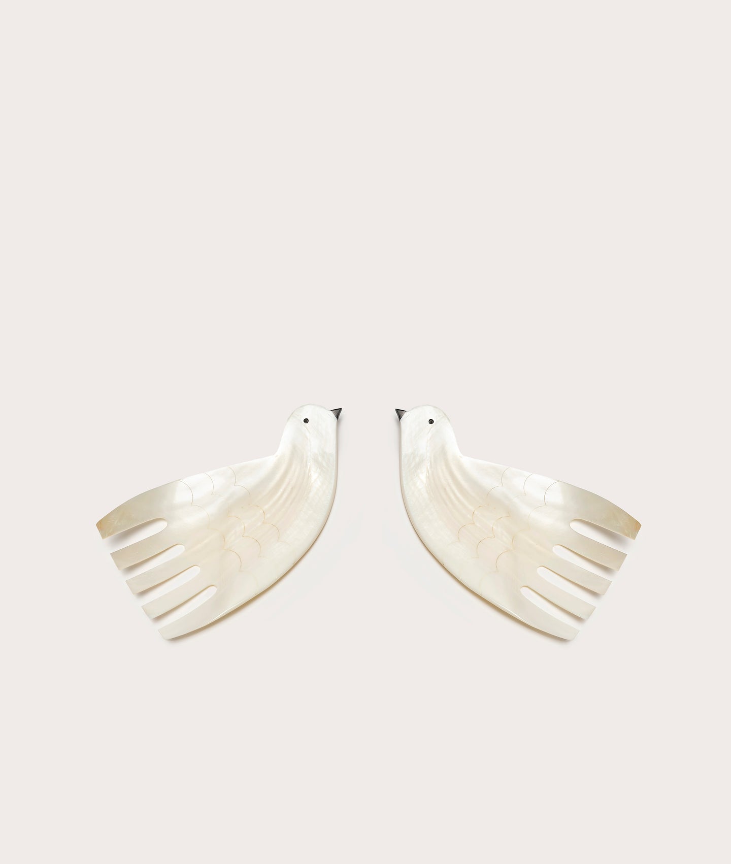 A pair of petite Mother of Pearl salad servers. Bird-shaped utensils that make tossing a salad feel like a flight of fancy.